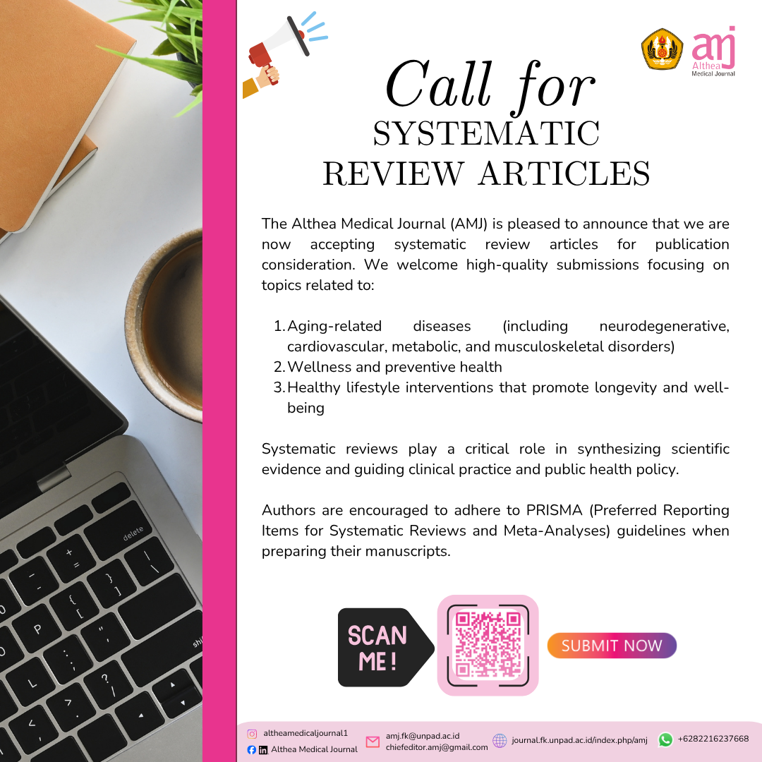 We welcome high-quality submissions focusing on topics related to: 1. Aging-related diseases (including neurodegenerative, cardiovascular, metabolic, and musculoskeletal disorders) 2. Wellness and preventive health 3. Healthy lifestyle interventions that promote longevity and well-being Systematic reviews play a critical role in synthesizing scientific evidence and guiding clinical practice and public health policy. Authors are encouraged to adhere to PRISMA (Preferred Reporting Items for Systematic Reviews and Meta-Analyses) guidelines when preparing their manuscripts. Submit your work through our online submission system at http://journal.fk.unpad.ac.id/index.php/amj/about/submissions For inquiries, please contact the editorial office at amj.fk@unpad.ac.id
